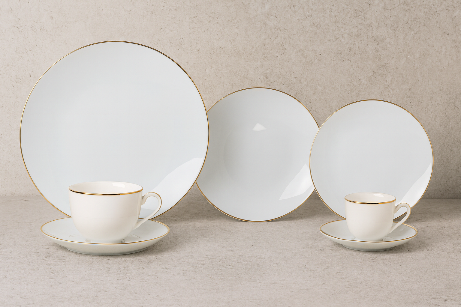 - Conteúdo: 06 pratos rasos 26.5 cm, 06 pratos fundos 20.5 cm, 06 pratos de sobremesa 19 cm, 06 xícaras de café com píres 90 ml, 06 xícaras de chá com píres 220 ml