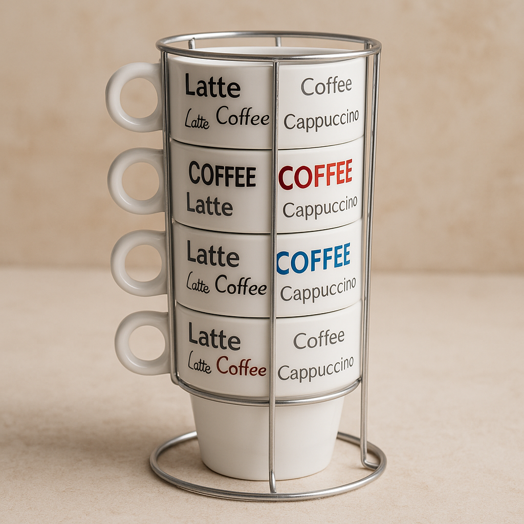 - Conteúdo do conjunto: 04 xícaras, 01 suporte