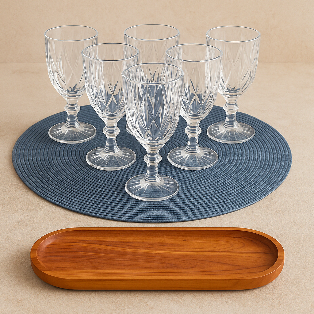 Kit Sábado à Noite – Taças Diamond + Sousplat Luna Azul + Bandeja de Bambu Oval
